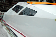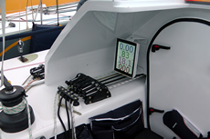 The cockpit is deep, both lowering VCG and increasing protection for the crew, with a central elevation that allows access down below to the escape hatch in the transom. There are twin tillers and, with a mainsheet track in the way, the shape of these took some working out to enable full rudder angle to be achieved. There is some protection around the sides of the cockpit (although this can be adapted according to what an owner wants) and there is even a sliding hatch over the companionway.