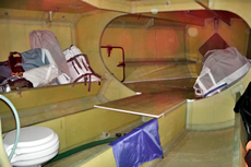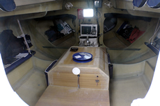 Down below the finish is bare glass with the engine box in the middle of the saloon and with the galley and nav station on the main bulkhead. There is a pipecot on either side of the main 'saloon' area and a plumbed in head mounted on the forward side of the main bulkhead.