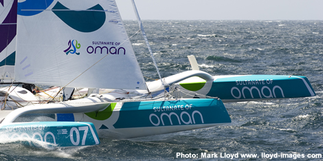 It is likely that Prince de Bretagne will spend much time up against the three modified MOD 70s taking part as a ‘race within a race’. Having destroyed the Irens-Cabaret 100ft tri Oman Air in the last race (that boat’s still in bits in a shed in Lorient…), former Volvo Ocean Race sailor Sidney Gavignet is back with Musandam-Oman Sail. He will no doubt be feeling all the stronger after his recent lap of the UK in the Sevenstar Round Britain and Ireland Race during which, impressively, his 70 footer bettered the record time of Banque Populaire/Spindrift 2, a boat almost twice Musandam-Oman Sail's length.