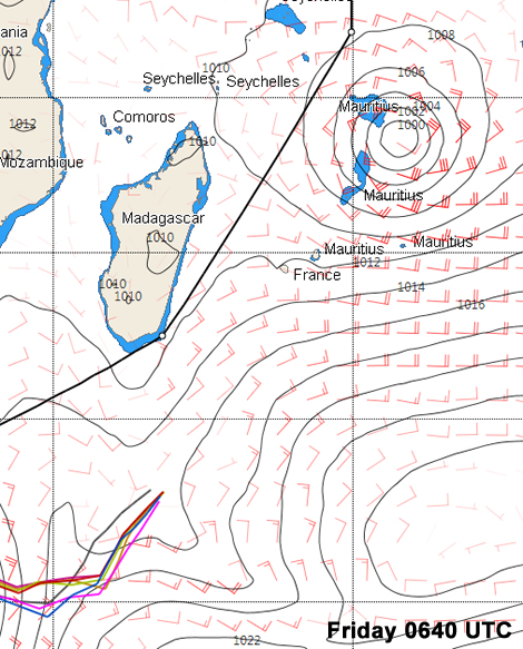 The met situation is forecast to change dramatically over the next 24 hours with the high disappearing off to the southeast, leaving a relatively shallow depression behind it to the south of Madagascar. The boats will be negotiating the eastern flank of this, unfortunately with the wind backing into the northeast or even the NNE, putting them on to a starboard tack fetch taking them towards the south side of Madagascar.