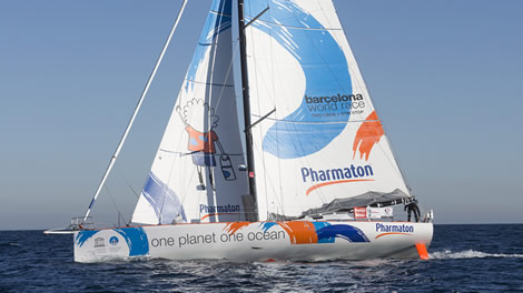 The old lady of the fleet is One Planet, One Ocean and Pharmaton, which once upon a time was Dame Ellen MacArthur’s Kingfisher (2nd in the 2000 Vendee Globe and Route du Rhum winner in 2002). Somewhat long in the tooth now, this, the most successful of British IMOCA 60s, has since resided in Spain and has taken part in the last two Barcelona World Races, first as Educación Sin Fronteras sailed by Albert Bargués and Servane Escoffier and then with Gerard Marín and Ludovic Aglaor as Fòrum Marítim Català.