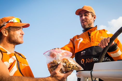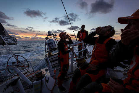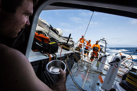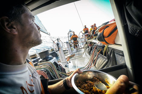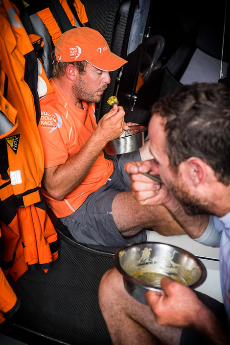 Typically the crew eat either before or after their watches: “The first meal - depending on where we are in the world, whether it is hot or cold and whether the guys are working hard or not - will either be a bag of cereal or muesli/granola or a full freeze dried meal. So for example – the first leg, the first two thirds of it was cereal and muesli and the last third in the South Atlantic when the weather deteriorated and the guys were working pretty hard and burning quite a few more calories, we shifted to three freeze dried meals/day.”