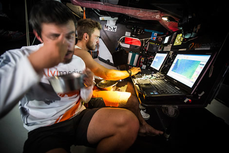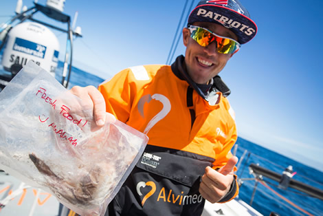Back to basics and crucially they are not allowed in way to help sail the boat. According to Team Alvimedica’s OBR Amory Ross this means “essentially I am prohibited from doing any ‘performance enhancing’ activity. That means no driving, no trimming, no stacking, etc. Those are the big three. [In addition to my media work] my duties are the food – so nutrition and preparing the meals and the bars, etc. I love that actually. It is exhausting and it is a lot of work, but I treat it like my watch partner - it keeps me motivated and keeps me on a schedule and I love being able to help. It is something that makes me feel like I am earning my ticket.”