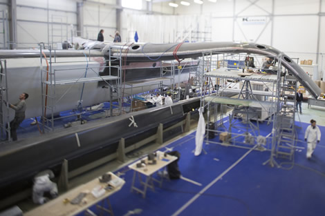 François Gabart is pleased to see the platform almost complete: "It now looks like really a boat. If I stand in the cockpit and close my eyes, I begin to see how I'll do manoeuvres, which until now has been very abstract."