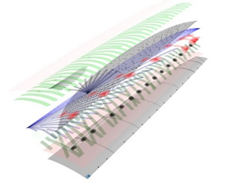 The pre-impregnated strips are laid and laminated on a marble table. On this they are then vacuum bagged and compressed with heat under more than six bars of pressure, and then bonded with a recyclable, solvent-free thermoplastic resin. As with Incidence's D4 Premium fabric, the membrane is manufactured in a single operation. It is then shaped on the floors of the Incidence sail lofts.
