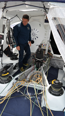 On both Gitana and Banque Populaire there have been attempts to reduce the amount of effort it takes to transfer the stack. Down below on Gitana, as mentioned, the main feature is the giant Cuben fibre ramp. The ‘chart table’ or rather the carbon fibre panel covered in electronics, including comms gear, computer screen and Josse’s alarm (maximum time = 30 minutes), can be rotated both to weather between tacks or stowed forward, out of the way, for when the stack is passing through.