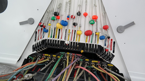 Another difference between Gitana and Banque Pop is in the way the lines run back down the boat. On both, lines run aft from the bow through a tunnel that descends down, towards the main bulkhead. Here, any water that may have got in empties into the canting keel box. However on Gitana , the lines then run aft through the main saloon area, in a single central tunnel, low down before emerging into the cockpit in a central pit area between the twin companionways. The twin watertight doors are built in an elaborate way so that they avoid colliding with the pit area. As ever on these boats there is a massive amount of rope, including for example for the locks on all the halyards and instead of regular clutches everything can by held by constrictors.