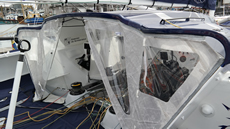 There is also a move in these boats for the skipper to be able to operate almost entirely from on deck. On Gitana, Josse can sleep at his seats in the cockpit, which is now entirely covered and features a new plastic cover to enclose its aft opening (yes, like a cruising boat bimini). Into this enclosed area comes every sail control, there is a pedestal for Josse to grind, a swing out computer to do his routing and he can even reach the galley, just inside the twin companionways.