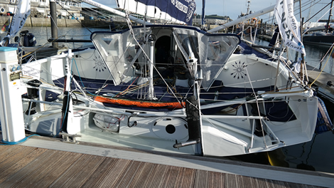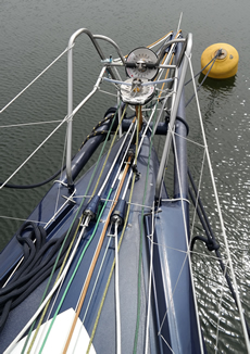 In the cockpit, most noticeable is how low the four winches are. This is to lower the overall CoG of the boat and as Josse observes, he rarely has to top handle (because he uses the pedestal) and if he does, it is easier on his knees because of the often heinous motion of the boat makes standing up difficult. Added over the winter has been a carbon fibre tubular structure to hold rope bags bang in the middle of the cockpit. These would really get in the way if this were a fully crewed boat, but for Josse, alone, they work just fine.