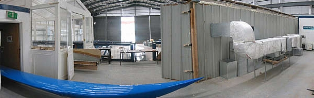 NEG facilities in Woolston with (L to R) SAILROCKET hull moulds, 10x3m. oven with external heater, filter and fan unit.