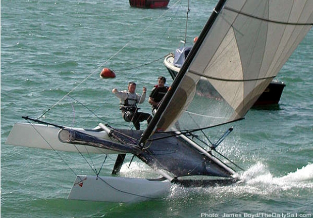 Following this the Formula 16 rule was established and at the beginning of 2002, Pierce revamped the Stealth 16 to bring it up to the full spec of the rule - making it 20cm wider, moving some of the jib area into the main, putting a self-tacking jib on to it and T-foils with which they'd been experimenting.
