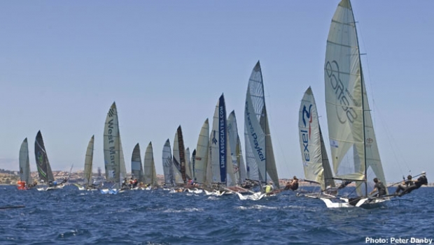 Racing for the Velamare Cup began yesterday (Monday) after a 24 hour delay caused by an administrative problem that prevented twelve of the Skiffs being unloaded from the trucks that brought them to Sardinia from the preceding event in Portugal.