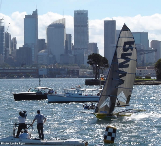 The first beat saw a big split in the fleet with some tacking close in to Bradley’s Point and others beating out into the bay. The right hand side paid and at the first mark it was AAPT helmed by veteran skiff sailor Trevor Barnabas leading followed by Casio, Computer Associates and Rag and Famish.