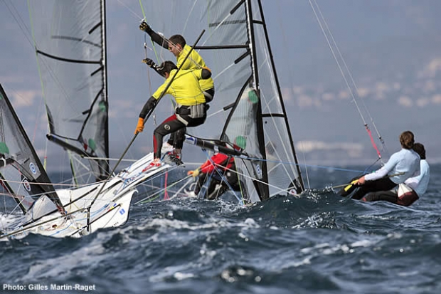 The Olympic Champions Iker Martinez and Xabier Fernandez edged closer towards the top of the leaderboard after another solid outing at Hyeres Olympic Regatta today. However Stevie Morrison and Ben Rhodes from Britain did enough to cling on to the overall lead at the end of the qualifying phase of this ISAF Grade One regatta. The Brits qualified with 24 points from their best eight races so far, followed by the Spanish on 25 points and the Danish brothers, Peter and Soren Hansen, third with 26 points.
