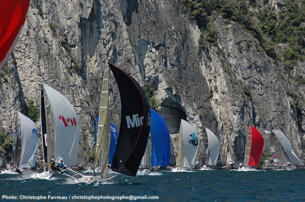 If you are interested in skiffs you should be here in Campione, Lake Garda. The biggest fleet of 18’s ever assembled outside Australia, including some of the finest sailors in the class have come together for this year’s European International Championship and today Garda delivered up what it is famous for. Bright blue sunny skies, deep blue iridescent water and, most importantly the wind, a perfect warm force four Ora wind blowing straight down the lake as steady as if generated by a giant fan and then of course there are the cliffs soaring 500ft plus straight out of the lake and generating a wind compression zone that acts like an express elevator up the course which every boat has to take.