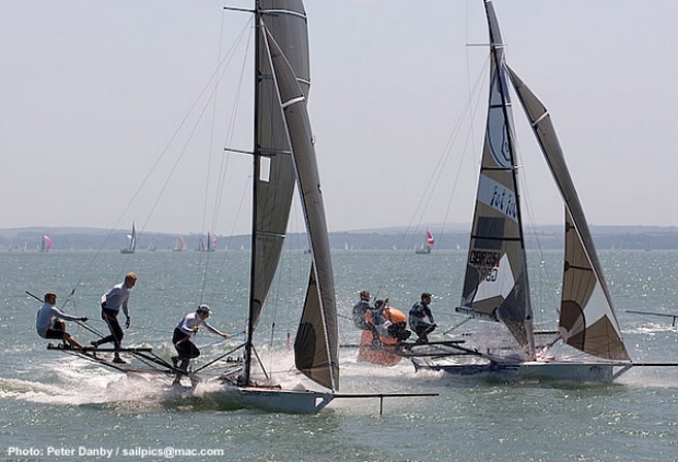 A fleet of ten skiffs hit the Solent this past weekend for round four of their UK Grand Prix series. Launching from the Calshot Activities Centre on Calshot Spit, racing was held under the capable direction of Warsash Sailing Club in a race area set off the Hillhead shore to keep the fleet out of the worst of the tide.