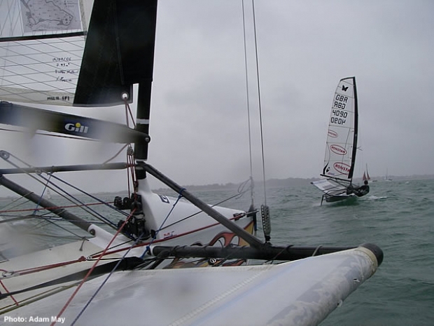 Payne led off the line, with Belben and May having words with a local cruiser who decided to yacht through the startline and see the action close up. May led round the windward mark after a capsize by Payne on his final tack up the beat, but a big pitchpole in front of the fast approaching Musto Skiff fleet let Jason Belben into the lead. Next it was Belben's turn to take a swim though, and up the second beat there was only about ten lengths between the three boats. Payne led round the windward mark for the second time, but managed an impressive pitchpole with May and Belben close behind.