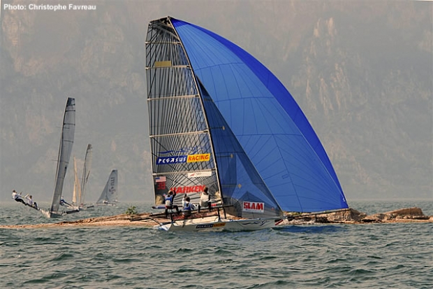 With the breeze getting up to 12-14knots, Pegasus Racing led the fleet up the first long beat from just north of Malcesine Castle with the island of Trimelone. The wind was split across the course and this resulted in teams coming out of both corners of the beat. Yandoo, TMF and SELS (GBR) were then closely followed by Pindar Radii, PICA (GBR) and a rare appearance of the Hungarian team HUN18 who picked out a right hand shift to perfection to round in the leading bunch. A downwind leg to the northern island of Ulivo was folllowed by a long fetch across the lake to the Campione side for a windward-leeward. The fleet then had long full power reach back across the lake before a long beat back up to the finish of Campione. Pegasus Racing kept their composure and scored another convincing win, effectivelly handing them the title for the scond year in a row. The battle for second place overall is now hotting up as Yandoo finished second and Pindar Radii socred another third. GE Commercial eventually finished seventh after their mainsheet parted, and this now means only six points seperate these teams for second place overall with three races planned for Friday, all to play for.