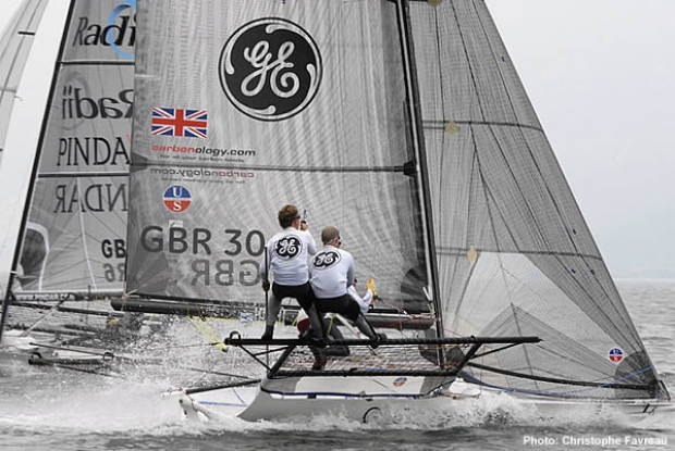 The action then was for second place overall with a three way battle between Yandoo (AUS), Pindar Radii (GBR) and GE Commercial (GBR). With only five points between them going into the final day, it was all to play for. GE Commercial, however, decided that guaranteeing the top European position was the order of the day and set about a very well executed match race during pre-start with Pindar Radii. The equation was simple - GE have the better discard, it was a case of hunting Pindar Radii down the fleet to bring those results into play and hence assuring the leading European skiff position. They went about their task with ruthless efficiency from the four minute gun managing first to force Pindar Radii into a crash gybe resulting in a capsize, and then forcing them out of the un-favoured pin end of the start line after they had quickly recovered from their dip. This meant both teams were at the back of the pack with GE in a commanding covering position.
