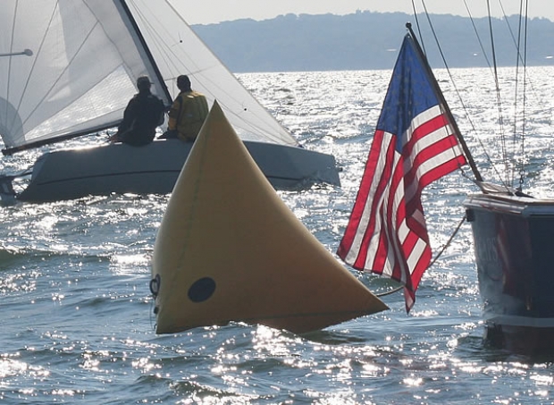 Saturday saw brilliant blue skies, a drop more wind and crews repatriated. Glenn again managed six one lap races back-to-back, which made starting bang on the line critical. There were the inevitable OCS’s, but rather than waiting until getting ashore to find out, boats had VHF for Glenn to politely ask them to restart. What the UK boats were perhaps learning most was just how shifty Long Island Sound can be. From the southwest, the gusts hit the water from above and scatter out in a fan shape, and in very specific bands. The good news was that if you’d started poorly, there were several chances up and particularly downwind to make amends. What was noticeable however, now that ‘points meant prizes’, was that there as a decidedly more ‘take no prisoners’ attitudes at the windward and leeward marks. However, a combination of beer and the Rugby World Cup final on the big screen ashore ensured that the ‘special relationship’ between UK and the US lived on. The entertainment was rounded-off Saturday evening with a Mount Gay sponsored bar and a talk from America Cup Race Officer in chief, Peter Reggio – what he doesn’t know or think about the Cup is not worth knowing.