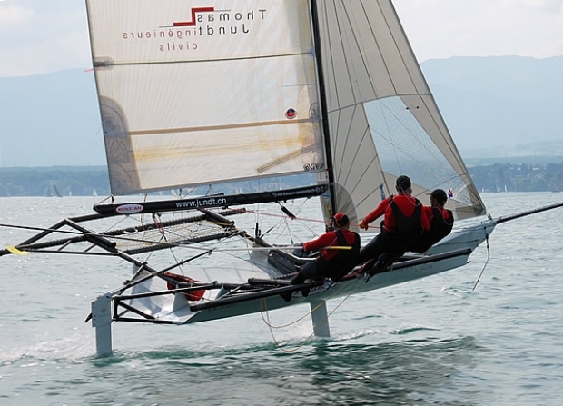 While foilers are gaining an increased foothold, to date this has been exclusively in singlehanded classes such as the Moth and the RS600 and we are still awaiting news of someone attempting a doublehander. In the meantime, in Switzerland, engineer Thomas Jundt has double-jumped this and for more than a year now has been zooming around Lake Geneva on a foiling 18ft skiff. Since