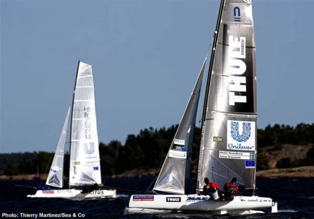 Finnish Olympic champion - and Lewander's erstwhile shipmate on Ericsson 3 - Thomas Johanson and his racing partner; talented young New Zealander Brad 'Junior' Marsh, also had problems and lost their rig just before the start of Wednesday's competition. As this was a pre-start incident, they were able to get help to effect some speedy repairs and join the race, albeit some time behind the rest of the fleet. "It took probably 25 minutes before we had the rig back up on the boat again, but by then we could see the other boats far away on the horizon. It was really a disaster this morning - but we did have some fantastic sailing conditions." said Marsh, striking a typically cheerful note.