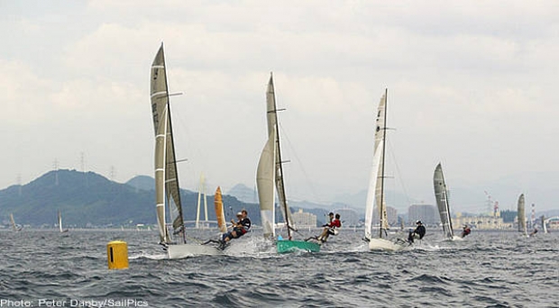 Using brains, boatspeed and excellent boat handling, Rob Greenhalgh and Dan Johnson of Great Britain won the opening race of the International 14 World Championship by two and three quarter minutes in Wakayama this afternoon (Tuesday).