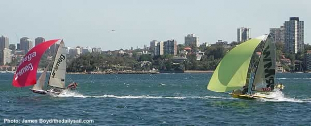 The breeze dropped slightly for the two sail reach to the mark off Clark Island and a clean swift hoist by Barnabas' team saw them take the lead. Omega Smeg continued to extend as the boat hurtled back towards Rose Bay, Rag & Famish losing ground as they appeared to be experiencing problems with with kite halyard.