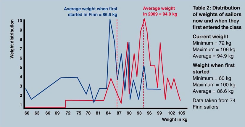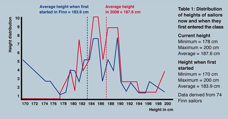 The numbers and graphs below really show the evolution of young people's physiques and the help that new mast and sail building materials have provided in making the Finn more accessible and available for a larger range of body sizes.