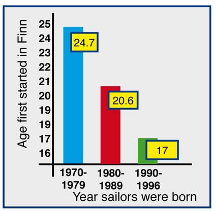 It is a widely reported fact that people across the world are getting taller and heavier through better diet and better standards of living and this is reflected in the results of the survey. Perhaps as a result of this, sailors are also starting in the Finn much younger than their predecessors did. In fact the average age for starting out in the Finn has dropped from 24.7 in the 1970s to just 17 in the 1990s.
