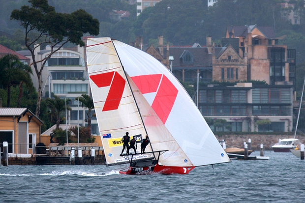 Gotta Love It 7 had elected to sail to the left hand side of the course while most of the others chose to gybe early back to the middle. 7’s move was a definite winner as the skiff raced to a big lead over Project Racing, Panasonic (which had followed 7’s move), Red Claw, Rag & Famish and Smeg.