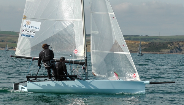 One of the most highly anticipated boats taking part in last week’s Artemis International 14 World Championship was the latest offering from design guru Paul Bieker. The last 14 design from Seattle-based Bieker, who has also been part of Oracle Racing’s design team, was the Bieker 5. These won the world championships in 2005 with Howie Hamlin and Euan McNicol and subsequently in 2008 and 2010 with Archie Massey. But in Weymouth last week was the first example of the new Beiker 6. This was being sailed by Kris Henderson, who builds the boat in Seattle, with Joe Bersch out on the wire, who is the money.