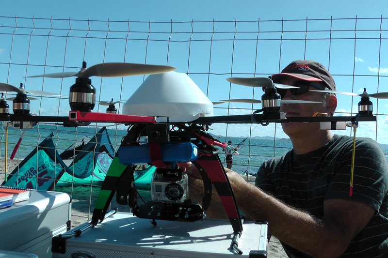 While the EUROSAF High Performance Grand Prix may be a first in bringing together the kiteboards, skiffs, foilers and catamarans in one regatta, another technical innovation being showcased here on Murcia’s Mar Menor is that of a remote control model helicopter from which high definition video can be shot.