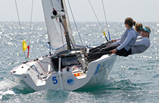 For the Women's Match Racing, there was a two hour wait for the sea breeze to fill in before completing the last two flights of the Gold Round Robin to seed the Quarter Finals.