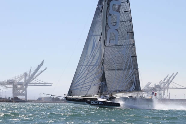Having set off from Gladstone’s pontoon in Rainbow Harbor Marina at around 1300 hours local time, the team on l’Hydroptère DCNS enjoyed a great day on the water, with 15 to 20 knots of breeze over the course of their first American sea trial.