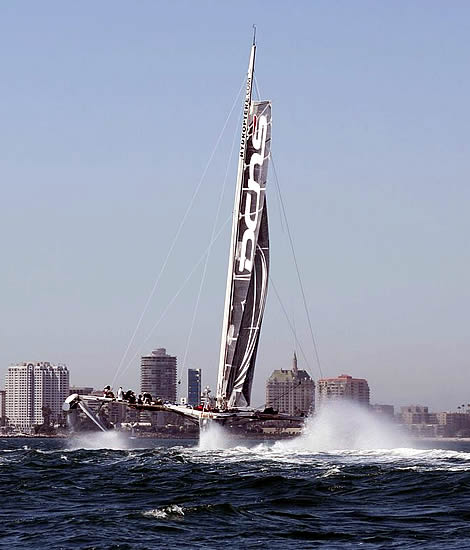 On Sunday afternoon, l’Hydroptère DCNS carried out her first sea trials in the United States. The flying trimaran initially put in some tacks off Long Beach before heading towards Catalina Island. It proved to be a gentle first outing in perfect weather conditions.