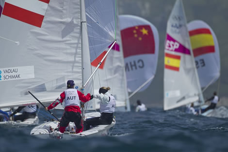 With two full fleet races to go tomorrow, the 470 Women has turned into a three horse race with the Kiwis leading after their two bullets today, now four ahead of the Brits with the Dutch in turn another three back. However the gap between Westerhof/Berkhout back to France's Lecointre/Geron is now 19 point and it will be interesting to see if this trend continues in the final two races tomorrow.