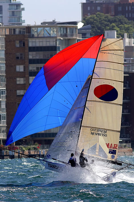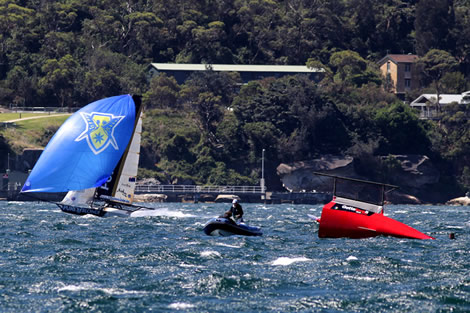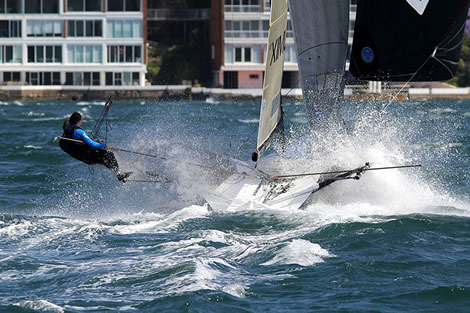 A gusty 25 knot northeast wind pounded the 18ft skiff crews as they contested race 5 of the AEG 3-Buoys Challenge series on Sydney Harbour today.