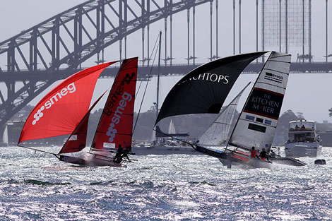 Coopers-Rag & Famish Hotel led at the first windward mark from Smeg, but carnage struck behind them as both De’Longhi-Rabbitohs (Simon Nearn) and Asko Appliances (Marcus Ashley-Jones) nose dived on the bearaway. Appliancesonline took advantage of the two capsized boats to move into third place, ahead of Pure Blonde, The Kitchen Maker and Rabbitohs-Kenwood (Brett Van Munster).
