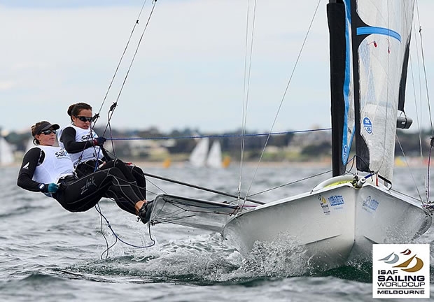 So after one race, Tessa Parkinson and Kate Lathouras (AUS) lead from Alex Maloney and Molly Meech (NZL). London 2012 Silver Medallist, Olivia Price was third, but as she is sailing as a mixed crew, she is not in medal contention. Anna Kendall and Michelle Muller are in fourth, accordingly.