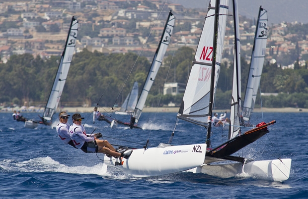 There were strong starts for the 2012 ISAF Youth Worlds silver and bronze medallists France and Argentina in the 29er fleet. Lucas Rual and Emile Amoros (FRA) and Argentina’s Klaus Lange and Ignacio Varisco sailed consistently with the French taking top spot on seven points. The Argentineans follow on nine points with America’s Quinn Wilson and Dane Wilson on 11 points in third.