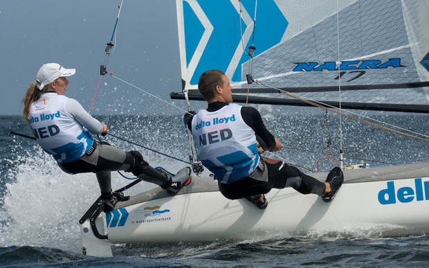 The most trying part today again was the current, which at some points was running at three knots. Not many sailors are used to this kind of current and struggled with it. After five races the Dutch team Mandy Mulder and Thijs Visser lead on seven points with France's Billy Besson and Marie Riou second, also on seven points, sorted on tie break.