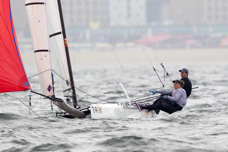 A full day of racing was completed at the Nacra 17 Worlds off The Hague, after yesterday the blue fleet had managed to sail just two races and the yellow fleet none. In order to get five results in each fleet the yellow fleet today had to sail five races and the blue fleet three - a challenge not just for the race committee, but the yellow fleet sailors too.