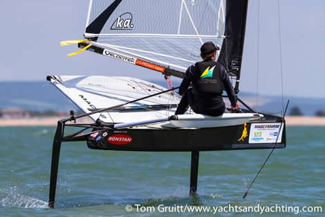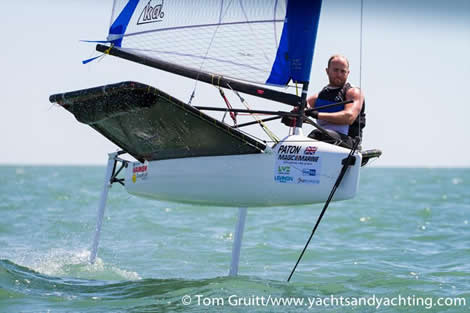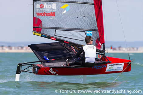 Mike Lennon described his race: "I think the tide has slackened and was turning so I thought going offshore was better. The pressure felt good going left. Going up the beat I tacked simultaneously with Chris. We were pretty much holding station but Rob suddenly was way ahead. When I got within 50m of the windward mark I got this massive knock; I went down about 15 degrees - Chris didn't get it! Suddenly from being in the hunt with those two, I was way off. Even when I tacked I had very little pressure to get back up on the foils. I was struggling a bit.