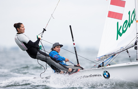The Austrian team of Lara Vadlau and Jolanta Ogar has been the steadiest performer in the Women's 470 fleet and that consistently has given them a slight, 4-point advantage going into the medal race. Today, in conditions that caused a few of their chief rivals to falter, Vadlau and Ogar were solid, with a 4-5-1. Fernanda Oliveira and Ana Luiza Barbachan have led the reagatta since winning both opening races. But a black flag disqualification in Race 8 and an 8th in Race 10 dropped them to second, one point in front of Shash Chen and Haiyan Gao (CHN). Marina Gellego and Fatima Reyes (ESP) are fourth. Sydney Bolger and Carly Shevitz are fifth, mathematically alive for a silver medal, but only barely.