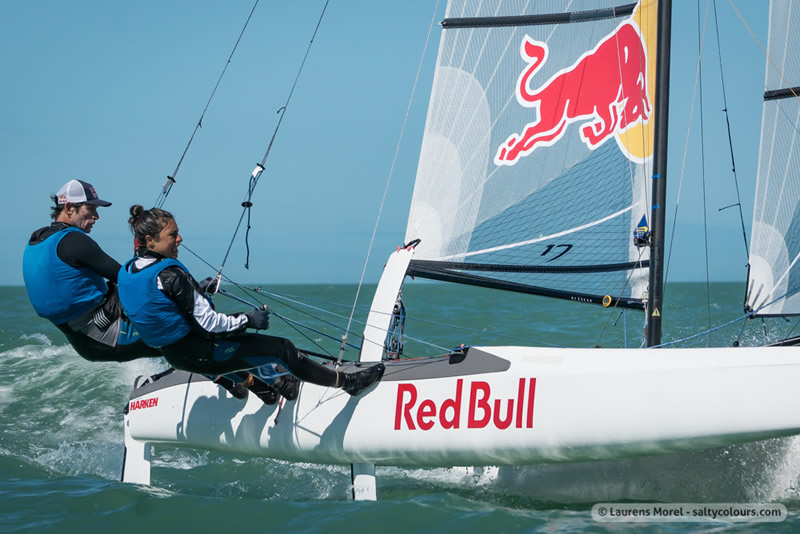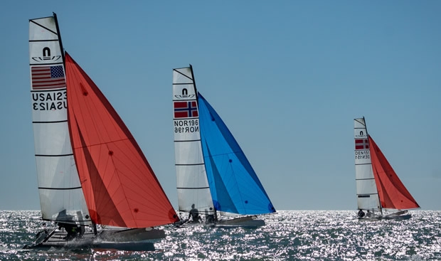 The long day in the Floridian sun didn’t seem to phase the three time Nacra 17 World Champion, Billy Besson who came out to win the first race of the day. Rio noted: “We are really happy with our performance thus far, especially after three long days.”