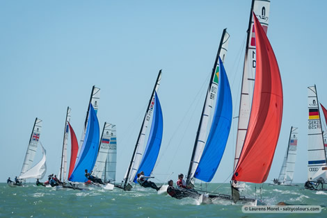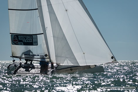 The fleet was sent out just before noon in a varying 8-12 knot breeze, and was back to the beach by 4:30pm. The fast and furious French team of Billy Besson and Marie Riou had a consistent performance throughout the four races that were held. Both of them felt satisfied, and pleasantly happy with the point spread they are currently sitting in. As it stands the French pair sit in first by a staggering 53 points (pending other changes in scores from other teams sitting behind them).