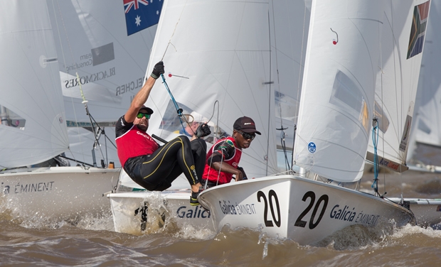 Watching the race unfold is intriguing, as the sailors analyse each section of the race track, try to anticipate how a threat can be dealt with, how they can catch the boat in front and work through the fleet. Perfecting that today with a superb tactical move were South Africa’s Asenathi Jim/Roger Hudson. They executed a text book gybe set to pass Germany’s Ferdinand Gerz/Oliver Szymanksi and win race 5, building on their 11th place in the day’s first race. With it, they jump to first overall on tiebreak with Spain’s Onan Barreiros/Juan Curbelo. Anton Dahlberg/Fredrik Bergstrom (SWE) in third.