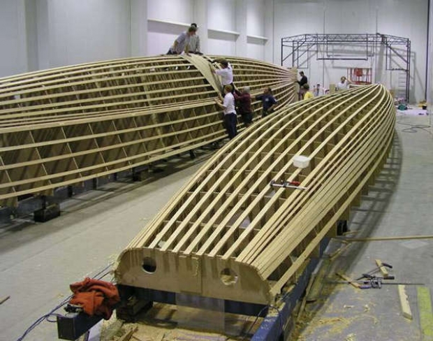 A 25-man build team are working on the construction of the new trimaran: "Boatspeed are in the first stage of construction, building the molds for the floats and beams and the plug for the main hull," explained Graham. Once this stage is complete the build team will be ready to start laminating the primary components: "We have to achieve maximum efficiency in the 'cooking' cycle," said Graham. "All these main components are actually being constructed inside a huge oven that is 40m long x 11m wide x 7.4m high - this means the mold tools don't have to move when the hull and deck are ready to be cured in the oven."