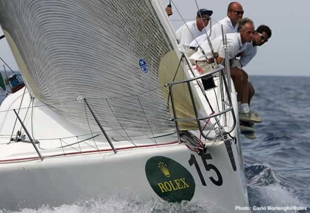The fleet of seven teams from six countries competing in the Sardinia Rolex Cup departed at noon today with eight knots of easterly breeze for the 26 nautical mile distance race. The course that started just outside Porto Cervo took this group of international sailors northwest past the island of Bisce up into Saline Bay and then northeast to 'I Monaci' and south back to the finish line.According to the sailing instructions, provision 18.2, the time limit for the long distance race is 18:30 hours and, "if the course is not completed within this time by at least one boat of each division the race is abandoned." All classes met the time limit with the exception of the Farr class. The race was officially abandoned and will be re-sailed tomorrow.